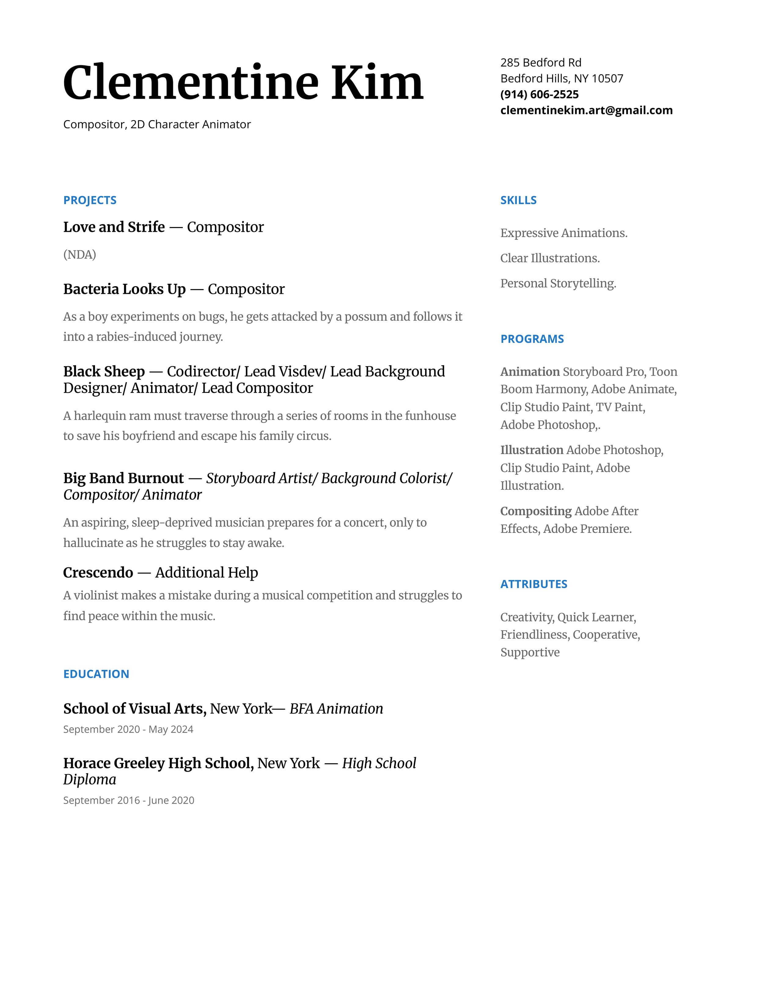 Hello! My name is Clementine Kim and I am a recent graduate from the School of Visual Arts, getting a BFA in Animation. Outside of drawing, I love to make songs and play video games. RESUME